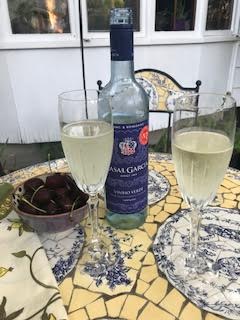 The evening was spent sitting out on her shaded back patio, sharing the tasty Portuguese wine, Vinho Verde. Jeanne discovered Vinho Verde while living in Portugal and we have quaffed many a bottle together. It is a “green wine”, released within 3-6 months after the grapes are harvested. It has a low alcohol content, slightly effervescent, and perfect for sipping on a sultry summer evening.