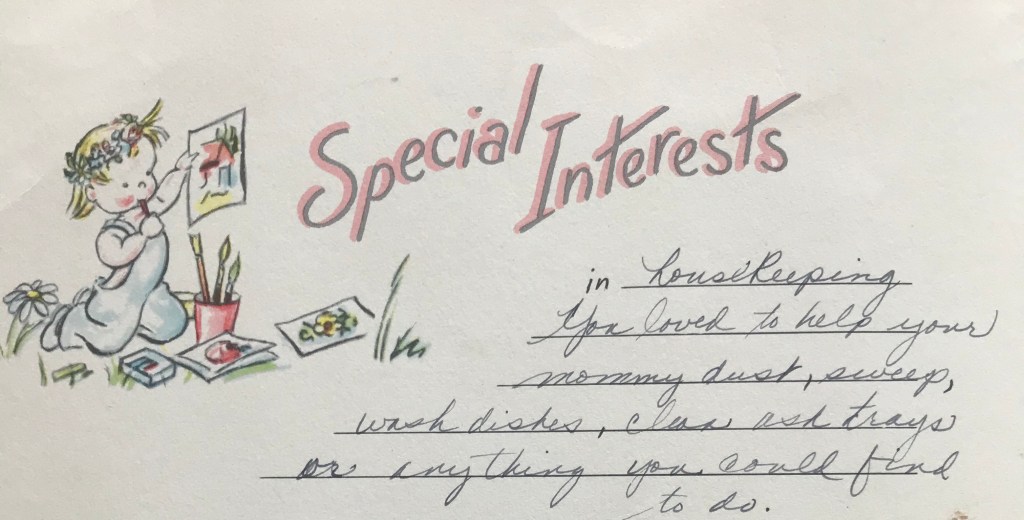 It was somewhat disconcerting to come across this description in my baby book, written by Jeanne stating that I had “Special Interests” in housekeeping. Interesting…