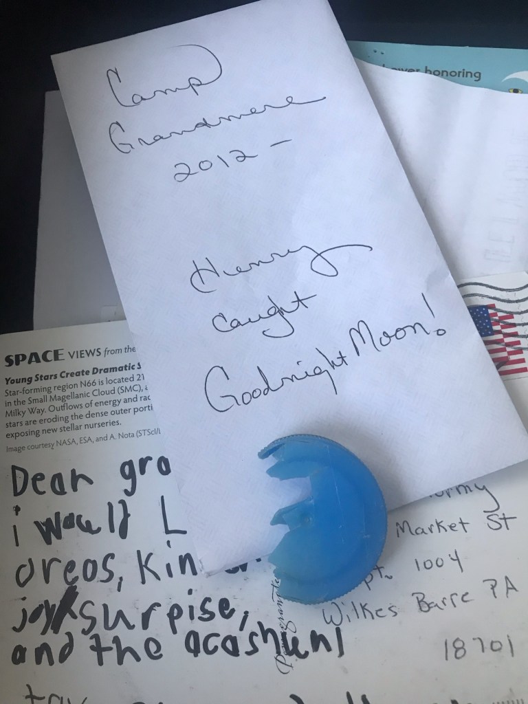 The last time Henry and Eli were able to visit, we had a grand time sorting through their boxes. They loved seeing birthday party invitations from birthdays they can’t quite remember. My favorite souvenir is from the first Camp Grandma in 2012. They were 2 years old. One afternoon while we were hanging out on the beach, Henry came running up to me excitedly saying, “I found Goodnight Moon, I found Goodnight Moon!” While playing in the sand, he had dug up a broken milk jug cap, but in his eyes, he had found the moon!