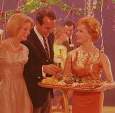 Entertaining at home became almost an obsession for some. They perfected the art of the cocktail. Out came the bowls of olives and nuts. The party dress was renamed the cocktail dress and shelled peanuts were no longer simply peanuts, but cocktail peanuts. Checking out the array of finger foods, you could pretty much count on the ubiquitous silver chafing dish brimming with warm cocktail weenies swimming in questionable red sauce!