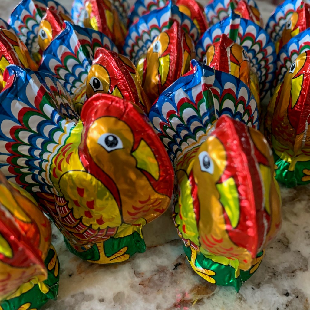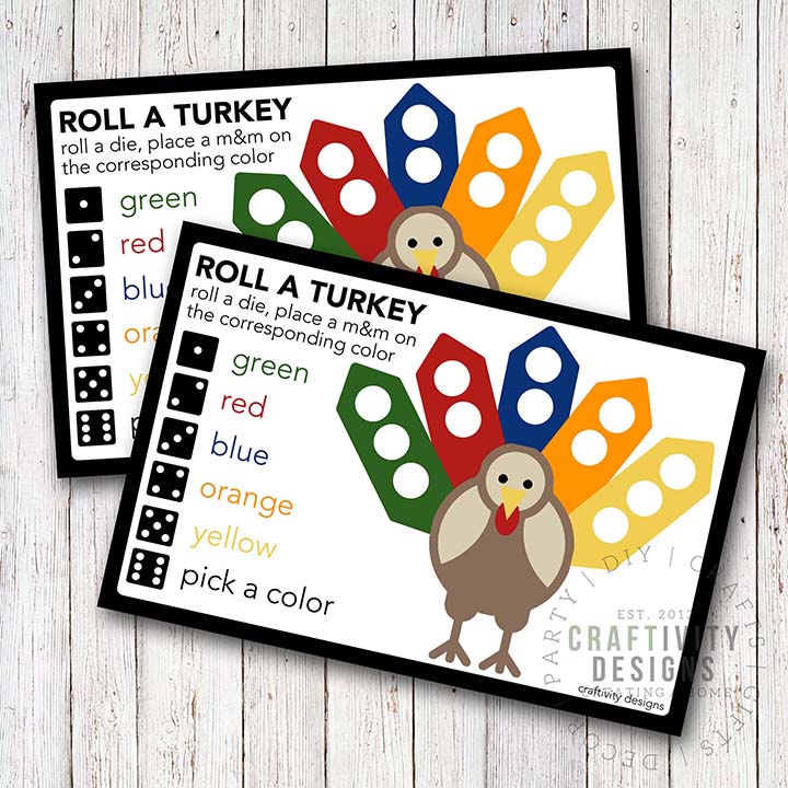 Chocolate turkeys that would normally be used as place setting favors on my holiday dinner table are being packed and mailed. I’m sending books, turkey crowns (saving one for me!) and other festive gee gaws. That’s all well and good, but how to truly engage my grandkids??? M&Ms of course! While searching the web for inspiration, I stumbled upon the blog, Unoriginal Mom, who posted Roll a Turkey – Free Thanksgiving Game for Kids. I will provide the M&Ms, dice and game cards. You roll a die and the number on the die dictates the color of M&M that gets placed on the turkey. Full instructions as well as the downloadable game cards are included in this link. Donning my turkey crown, I will connect with my grandkids on Facetime and let the good times roll.