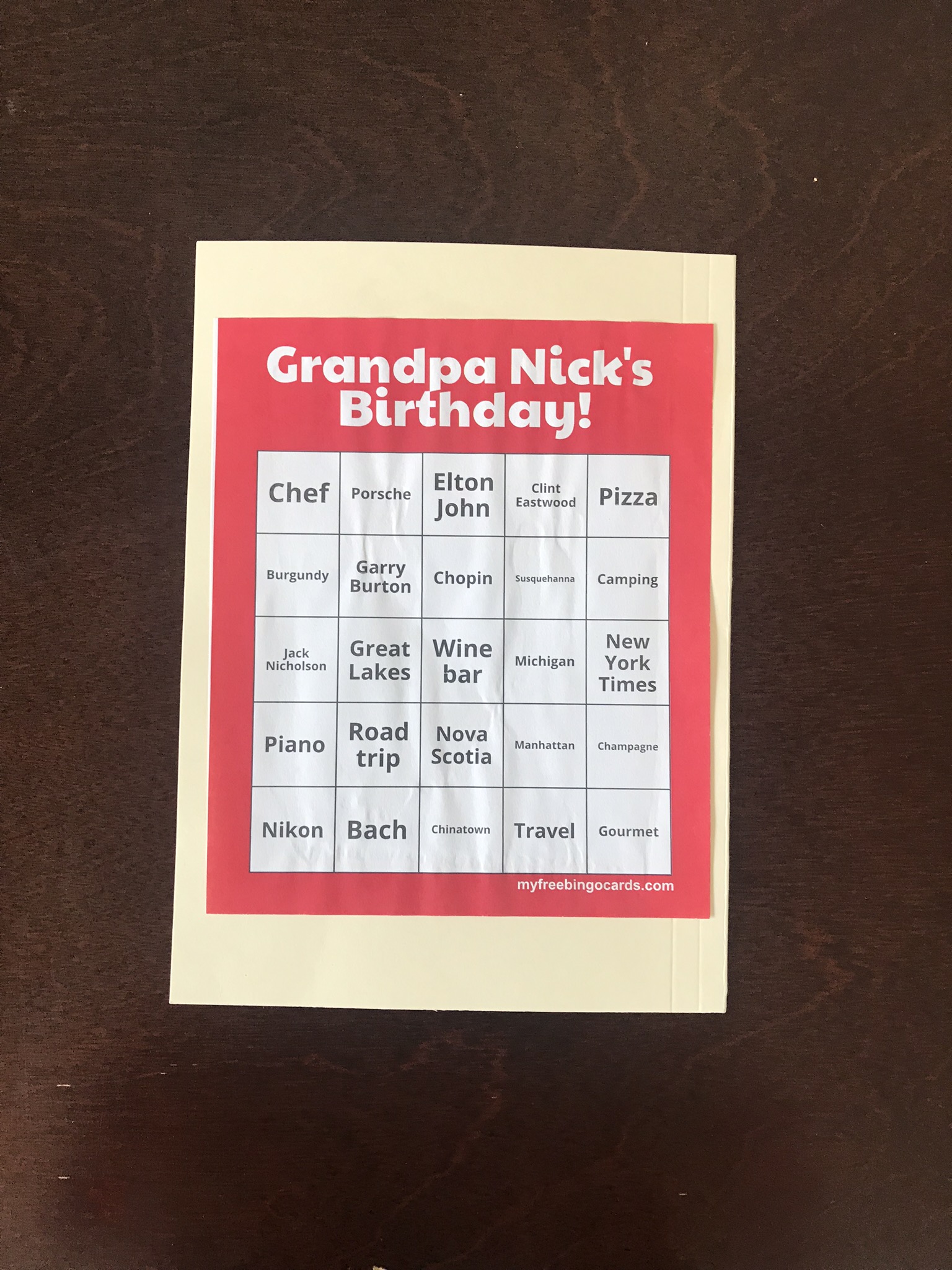 Our other game was Grandpa Nick Bingo. There are several online sites where you can create your own customized bingo cards for free! I entered a list of Grandpa Nick centric words and the program created some festive bingo sheets. I used spray adhesive to mount these onto cardboard to give them a little more substance. Using my Michigan Rummy nickels as bingo chips, we played several rounds before the grand finale of “blackout” bingo. All my grandchildren excel at yelling “Bingo!”